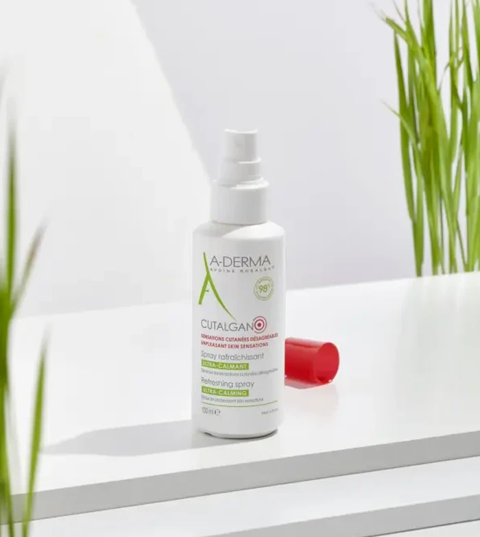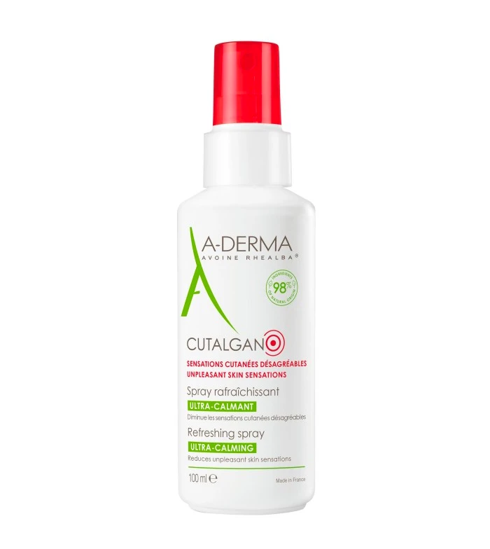 Le spray rafraîchissant ultra-apaisant A-Derma Cutalgan apaise les peaux qui brûlent, démangent ou piquent.
