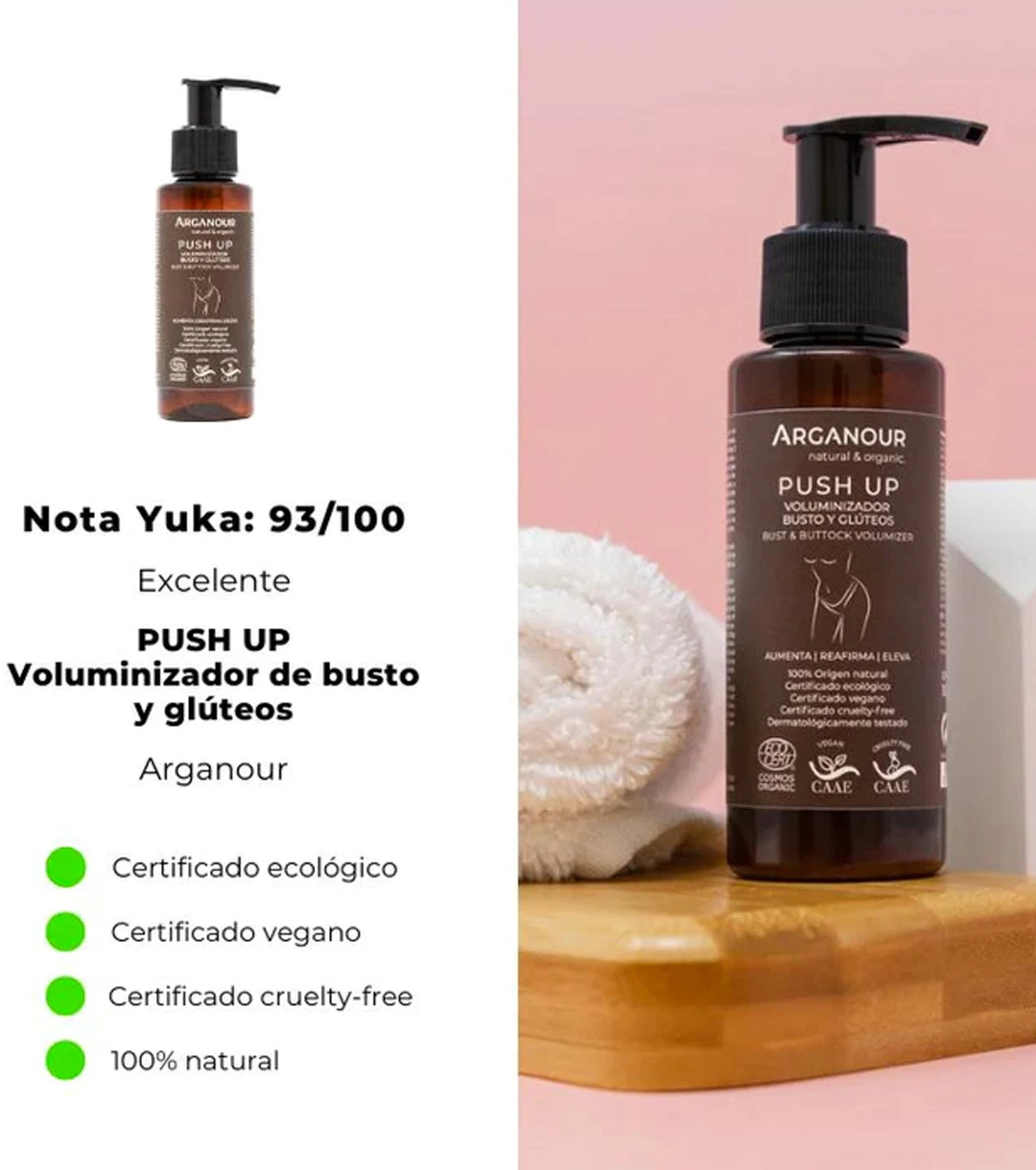 Le Volumateur Seins et Fesses Push Up d’Arganour est formulé avec des ingrédients 100% naturels et vegan : extrait de mûre, extrait de kigelia africaine, huile de fenugrec et une association d’algues rouges et de fougère noire.
