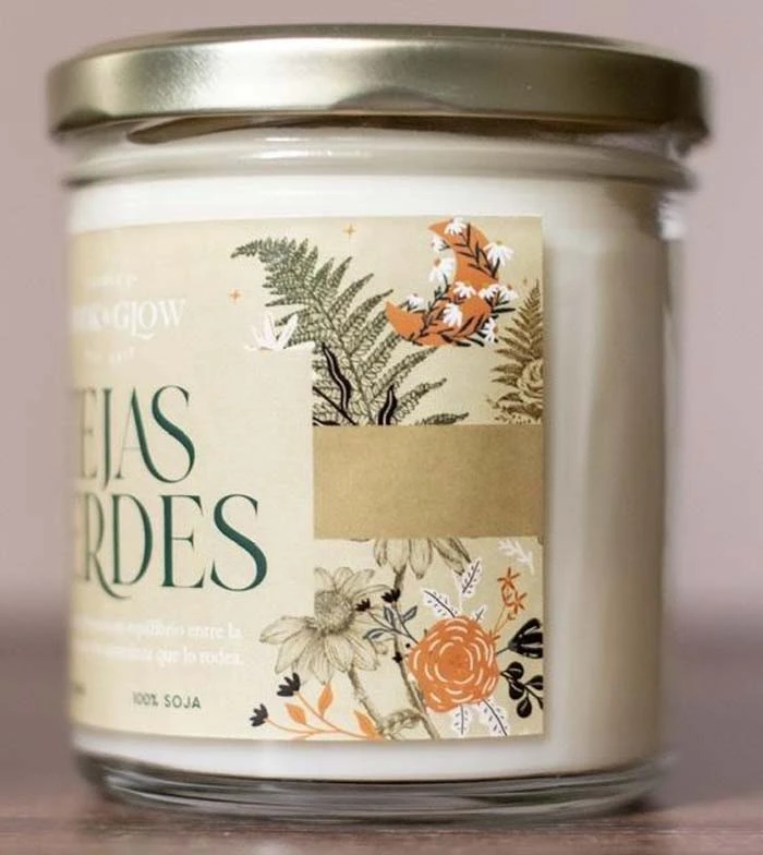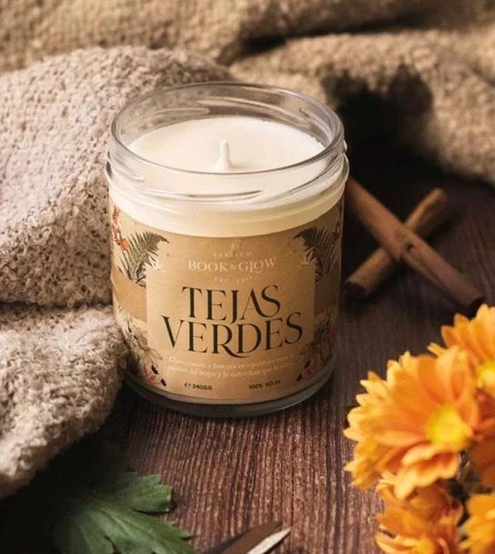 Bougie de soja de la collection Extraordinary Worlds de Book and Glow. Pignons verts.