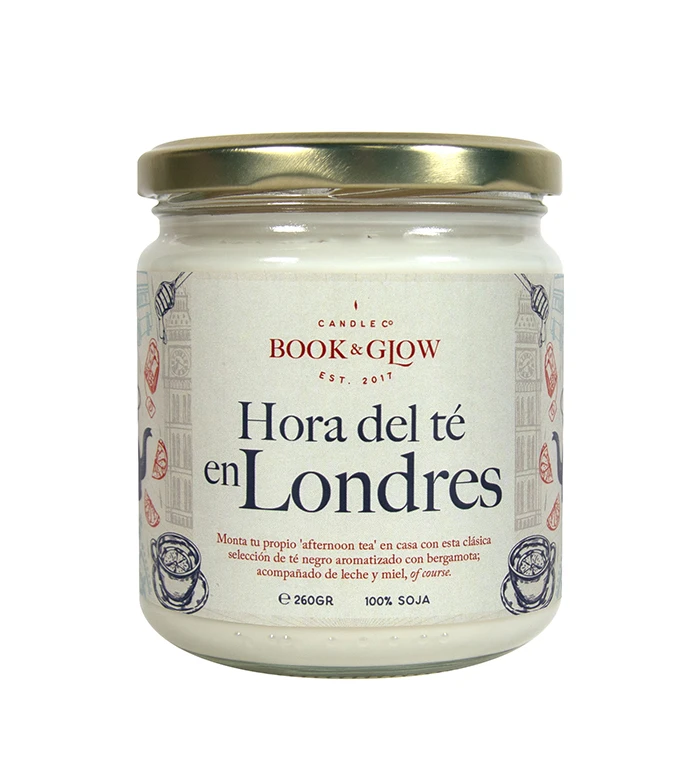 Bougie de soja de la collection Extraordinary Worlds de Book and Glow. L’heure du thé à Londres.