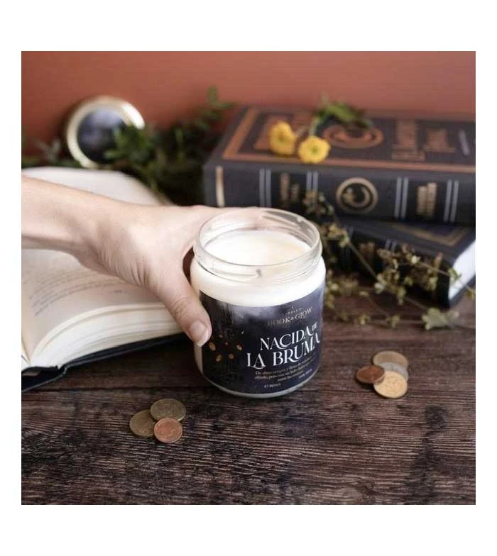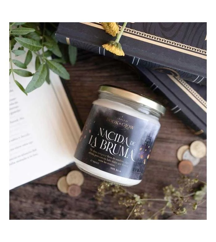 Bougie de soja de la collection Extraordinary Worlds de Book and Glow. Né des Brumes.