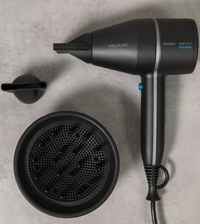 Un sèche-cheveux ionique avec diffuseur, design avec moteur AC, haut débit, avec de vrais ions, système Perfect Color et accessoires professionnels.