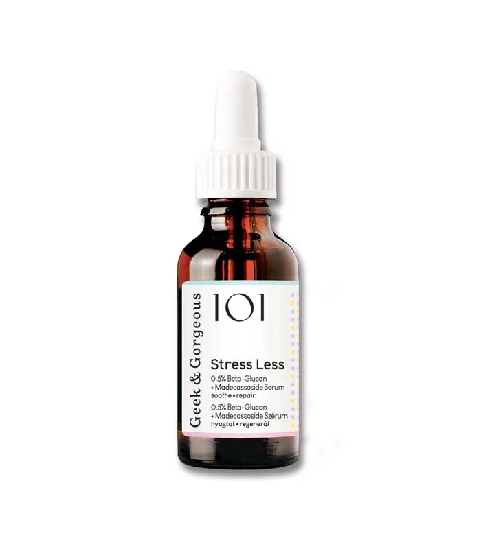 Sérum 0,2% Bêta-glucane et 0,3% Madécassoside Stress Less de Geek & Gorgeous avec une formule de type gel, légère et soyeuse.