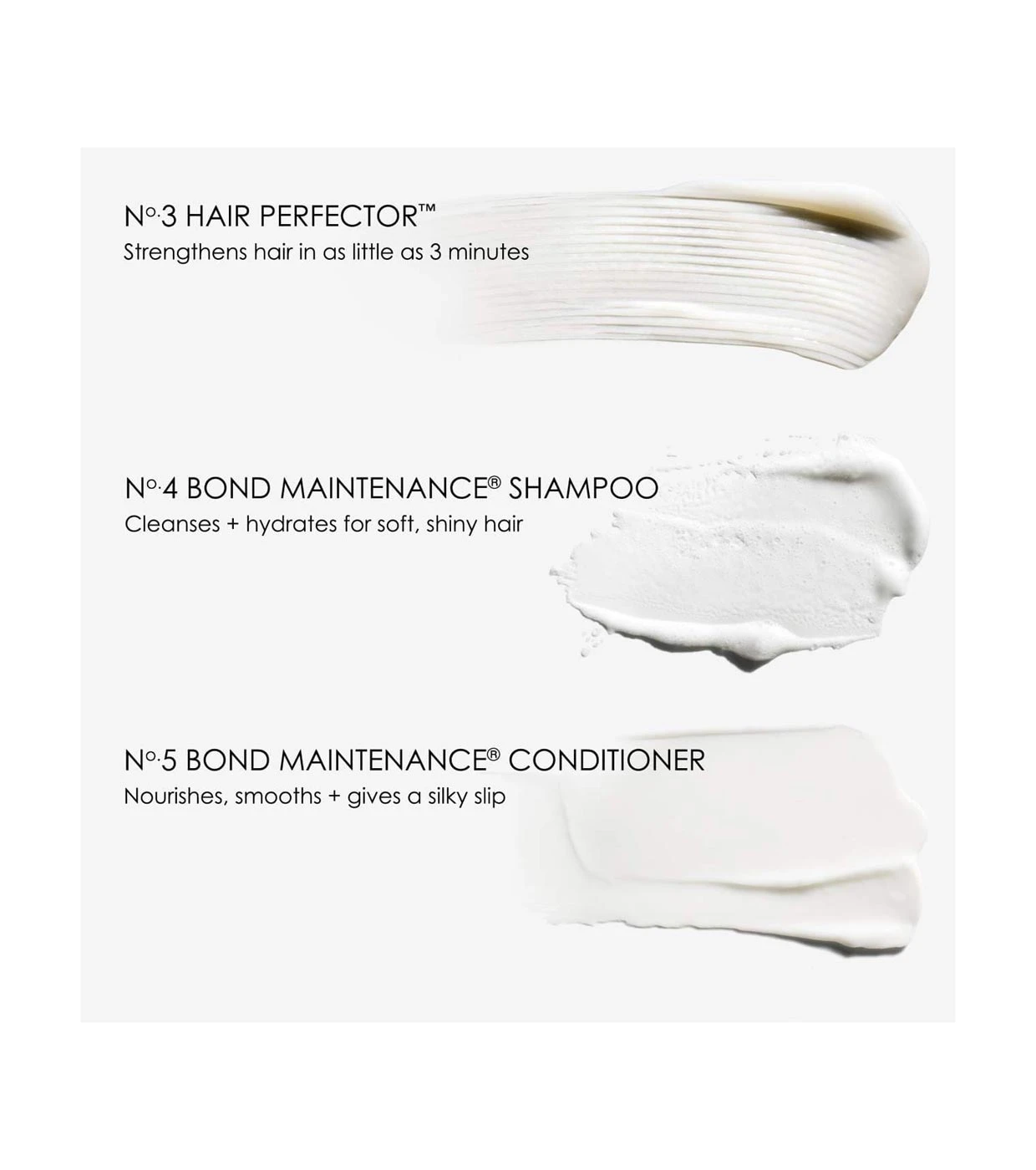 - 1 x revitalisant No.5 Bond Maintenance® (250 ml / 8,5 fl. oz.) : nourrit, réduit les frisottis et les pointes fourchues.
